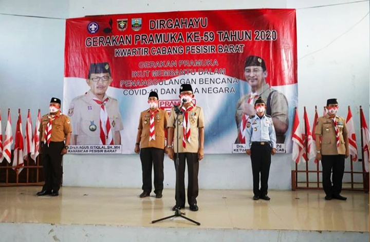 Bupati Pesisir Barat Dr.Drs.Agus Istiqlal SH.,MH. Memimpin Langsung Upacara HUT Gerakan Pramuka Ke-59 Tahun 2020 Tingkat Kwartir Cabang Pesisir Barat.
