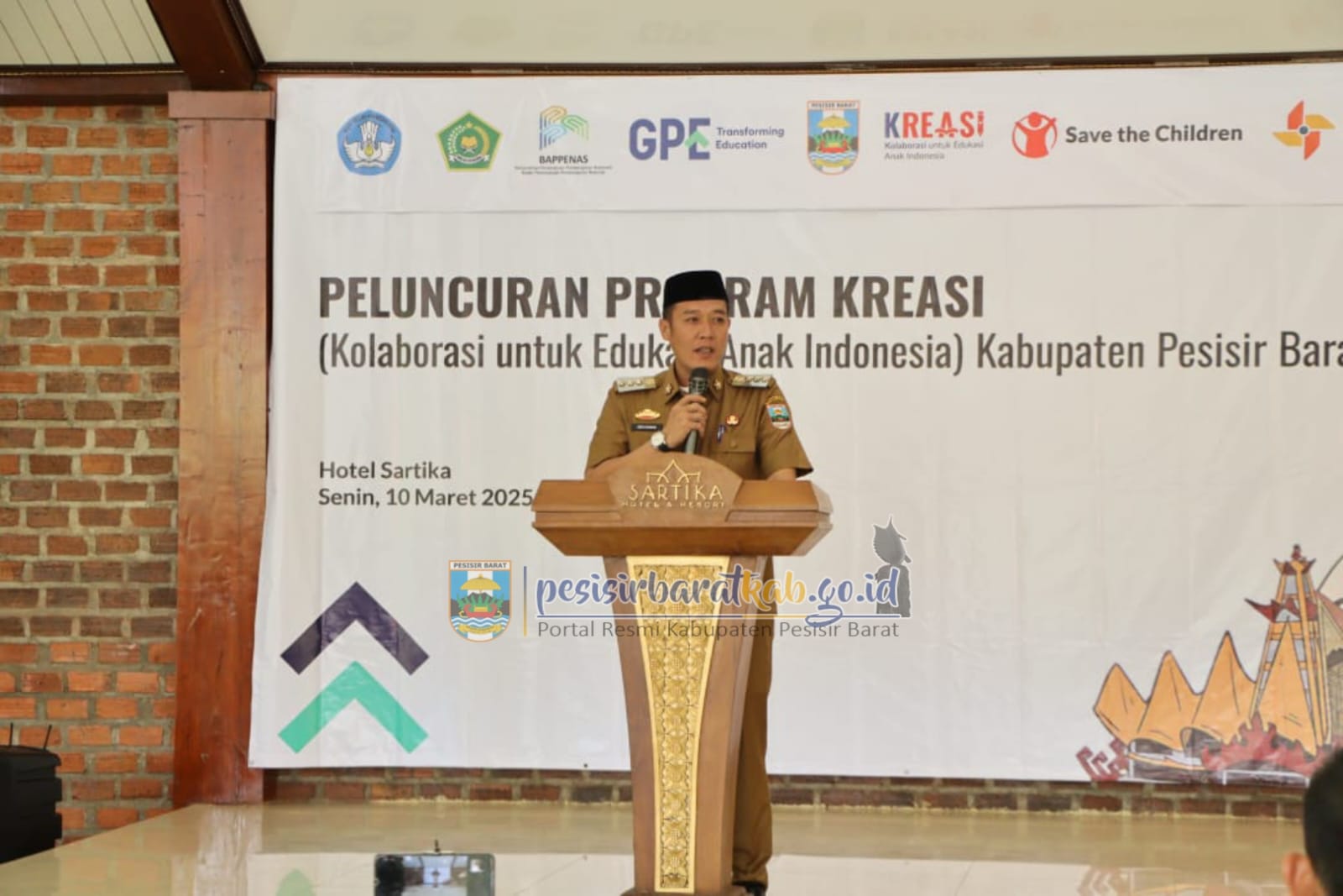 PESISIR BARAT-Kepala Dinas Komunikasi, Informatika, Statistik, dan Persandian (Diskominfotiksan) Suryadi, S.IP., M.M., menginformasikan bahwa, Bupati Pesisir Barat (Pesibar), Dedi Irawan menghadiri sekaligus membuka kegiatan Peluncuran Program Kolaborasi Untuk Edukasi Anak Indonesia (Kreasi) Pesibar, yang digelar di Aula Hotel Sartika Pekon Seray Kecamatan Pesisir Tengah, Senin (10/3/2025).