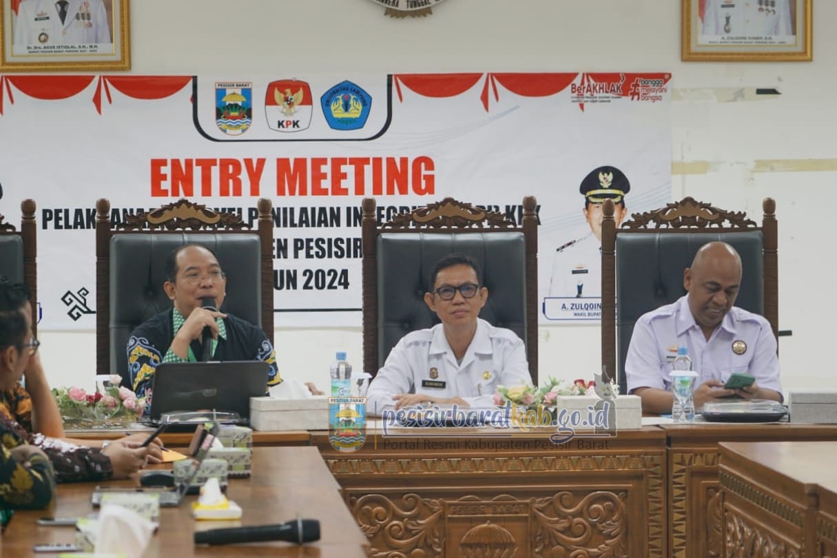 PESISIR BARAT-Kepala Dinas Komunikasi, Informatika, Statistik dan Persandian (Diskominfotiksan), Suryadi, S.IP., M.M., menginformasikan bahwa, Asisten III Bidang Administrasi Umum Sekretariat Pemerintah Kabupaten (Pemkab) Pesisir Barat (Pesibar), Drs. Gunawan, M.Si., membuka kegiatan entry meeting pelaksanaan Survei Penilaian Integritas (SPI) Komisi Pemberantasan Korupsi (KPK) di Pesibar Tahun 2024, di ruang rapat Bupati Lantai 4 Gedung A Komplek Perkantoran Pemkab Pesibar, Rabu (13/11/2024).