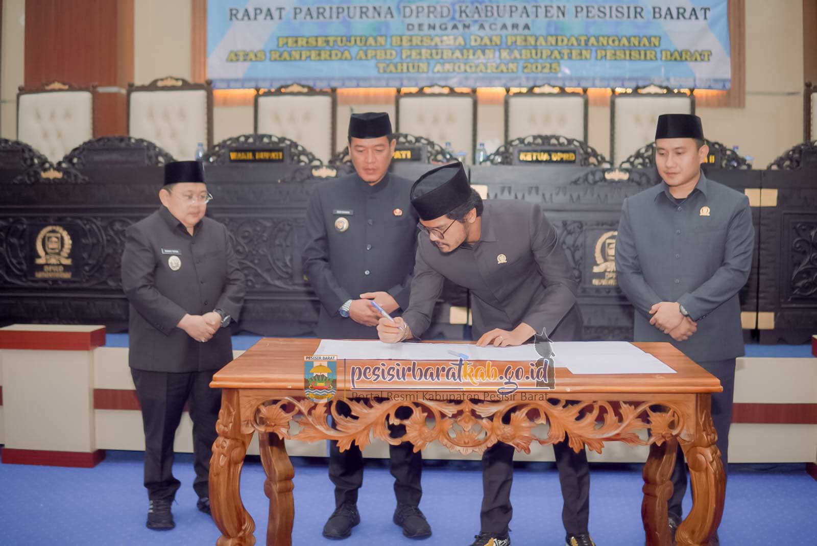 PESISIR BARAT-Bupati - Wakil Bupati Pesisir Barat (Pesibar), Dedi Irawan - Irawan Topani, S.H., M.Kn., menghadiri rapat paripurna Dewan Perwakilan Rakyat Daerah (DPRD) dengan agenda persetujuan dan penandatanganan atas Rancangan Peraturan Daerah (Ranperda) Anggaran Pendapatan dan Belanja Daerah (APBD) Perubahan Pesibar Tahun Anggaran 2025, di ruang rapat paripurna, Jumat (22/8/2025).