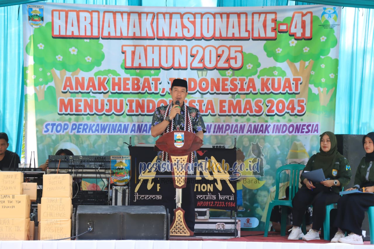 PESISIR BARAT – Bupati Pesisir Barat (Pesibar), Dedi Irawan, bersama Wakil Bupati Irawan Topani, S.H., M.Kn., menghadiri peringatan Hari Anak Nasional (HAN) ke-41 Tahun 2025 yang digelar di Cottage Pariwisata Pantai Labuhan Jukung, Kamis (24/07/2025).