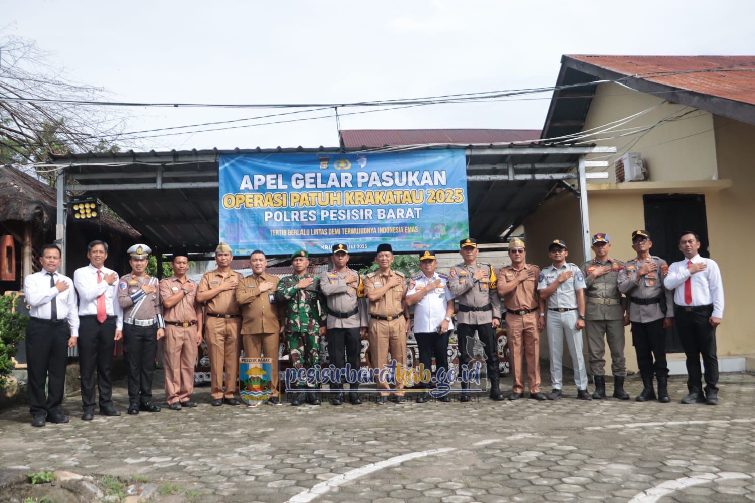 PESISIR BARAT-Asisten I Bidang Pemerintahan dan Kesejahteraan Rakyat Sekretariat Pemerintah Kabupaten (Pemkab) Pesisir Barat (Pesibar), Audi Marpi, S.Pd., M.M., menghadiri kegiatan apel gelar pasukan Operasi Patuh Krakatau Tahun 2025, di Mapolres Pesibar, Kecamatan Pesisir Tengah, Senin (14/7/2025).