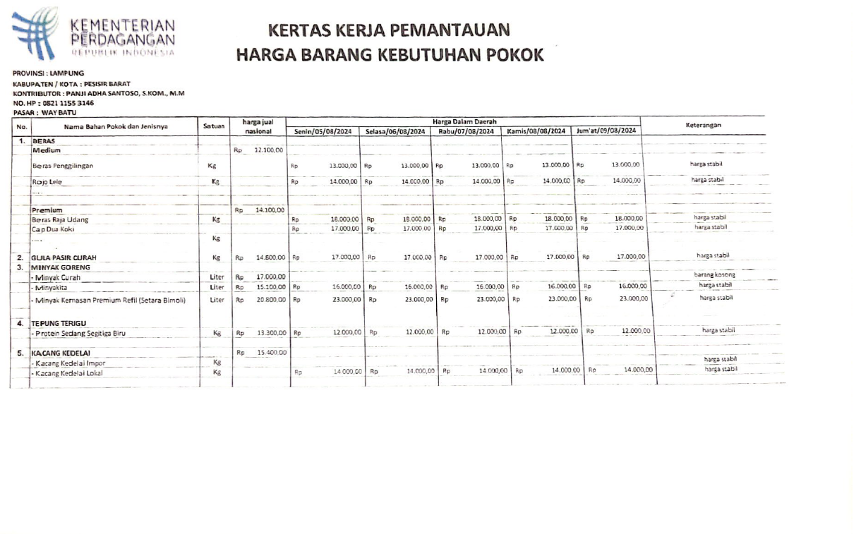 Pemantuan Harga Barang dan Kebutuhan Pokok di Kab. Pesisir Barat, Per 16 Agustus 2024