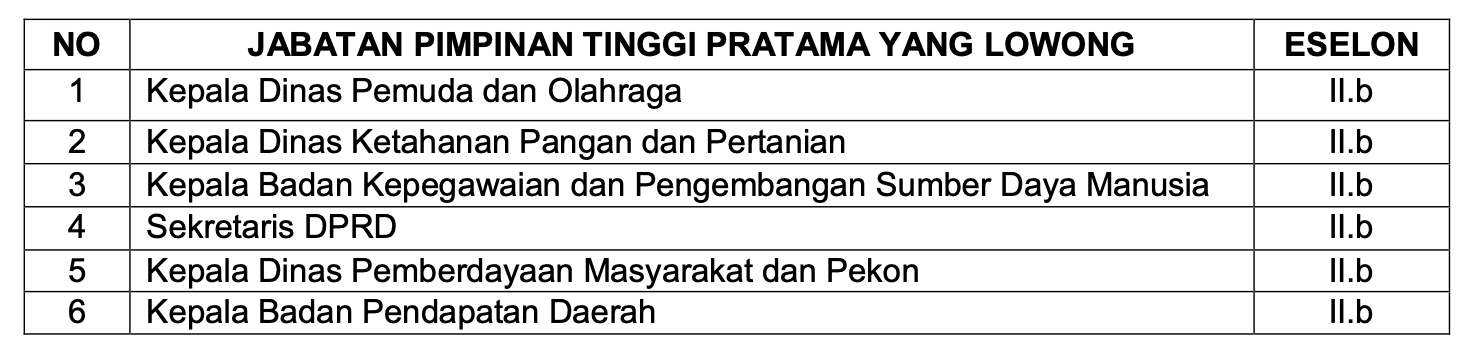 Adapun seleksi terbuka JPTP dibuka untuk mengisi kekosongan jabatan sebagai berikut :