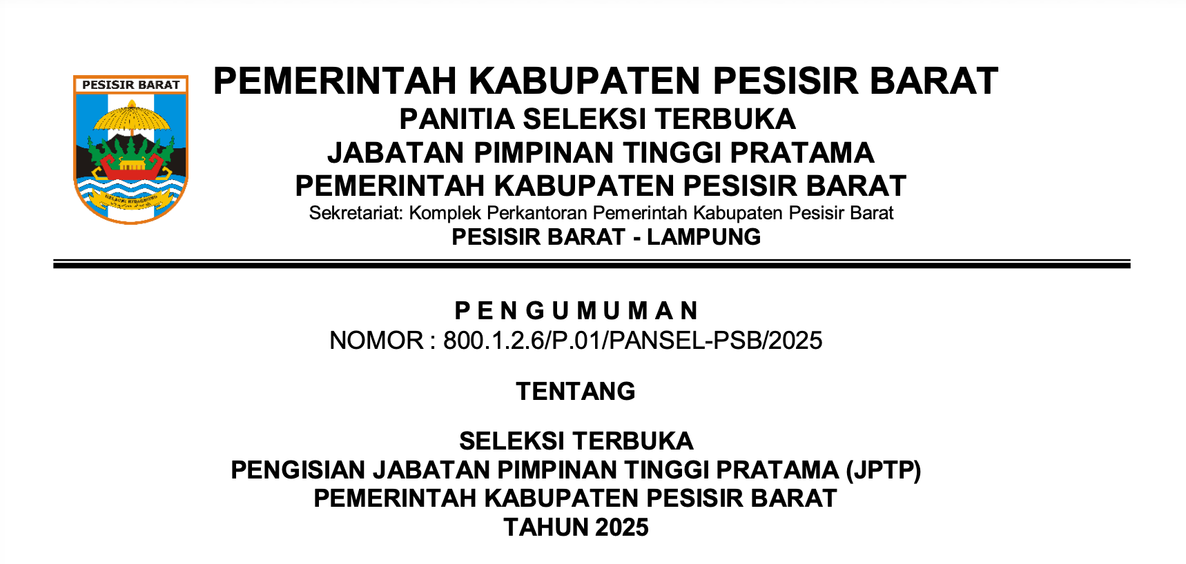 Dalam rangka pengisian Jabatan Pimpinan Tinggi (JPT) Pratama Pemerintah Kabupaten Pesisir Barat Tahun 2025, dengan ini kami membuka kesempatan kepada Pegawai Negeri Sipil (PNS) yang memenuhi syarat untuk mengikuti Seleksi Terbuka Jabatan Pimpinan Tinggi Pratama (JPTP) Pemerintah Kabupaten Pesisir Barat.