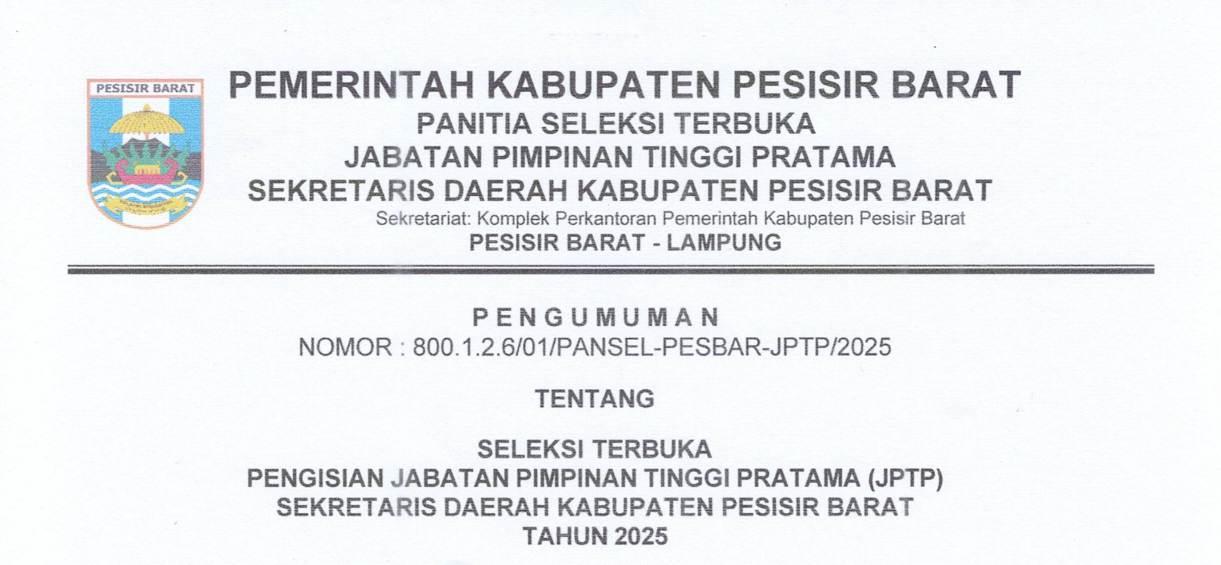 Dalam rangka pengisian Jabatan Pimpinan Tinggi (JPT) Pratama Sekretaris Daerah Kabupaten Pesisir Barat Tahun 2025, dengan ini kami membuka kesempatan kepada Pegawai Negeri Sipil (PNS) yang memenuhi syarat untuk mengikuti Seleksi Terbuka Jabatan Pimpinan Tinggi Pratama (JPTP) Sekretaris Daerah Kabupaten Pesisir Barat.